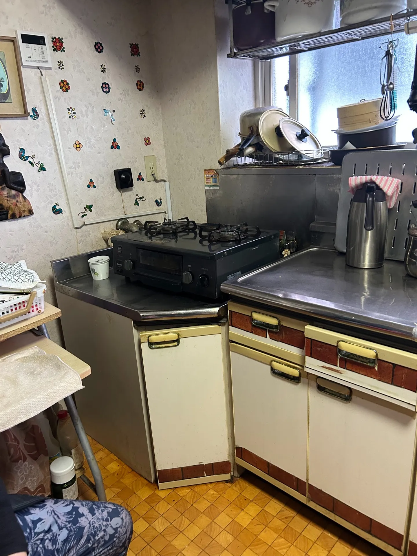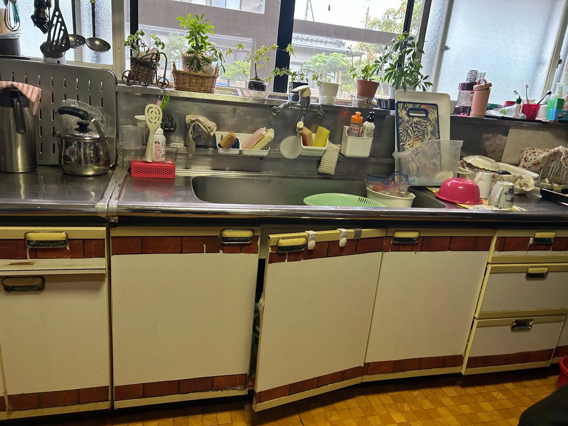こちらが以前のキッチン。 ガスコンロにタイル調の扉、そして窓際にはお気に入りのグリーンを並べていました。 これはこれで味があって好きだったのですが、やはりコンロ周りの隙間汚れや、開き戸収納の奥のものが取り出しにくいのが悩みでした。